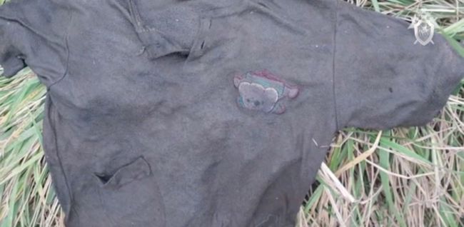 Особенности ребенка-девочки на вид от 7 до 9 лет: рост от 104,4 до 143, 4 см. Одежда: трикотажные колготки черного цвета; темно-зеленая футболка с застегивающимся воротом с аппликацией в виде лежащего медвежонка на груди слева, с биркой в области шеи, где изображены две панды и надпись Made in China; вязаная кофта черного цвета с длинными рукавами и тканевым рисунком в виде трактора оранжевого цвета, а также синими гусеницами и бежевым камнем на груди; вязаные носки темно-коричневого цвета. На девочке были деревянные бусы темно-серого цвета. С одной стороны веревки расположены четыре бусины, образовывающие фигуру в виде треугольника.