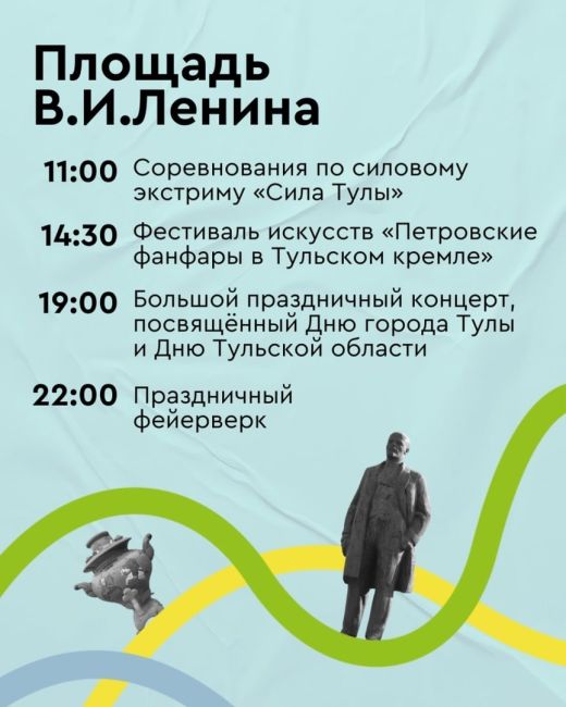 На площади В.И. Ленина пройдут соревнования по экстремальной тяжелой атлетике «Сила Тулы». Сразу после фестиваля искусств «Петровские фанфары в Тульском кремле» запланирован большой праздничный концерт и фейрверк.