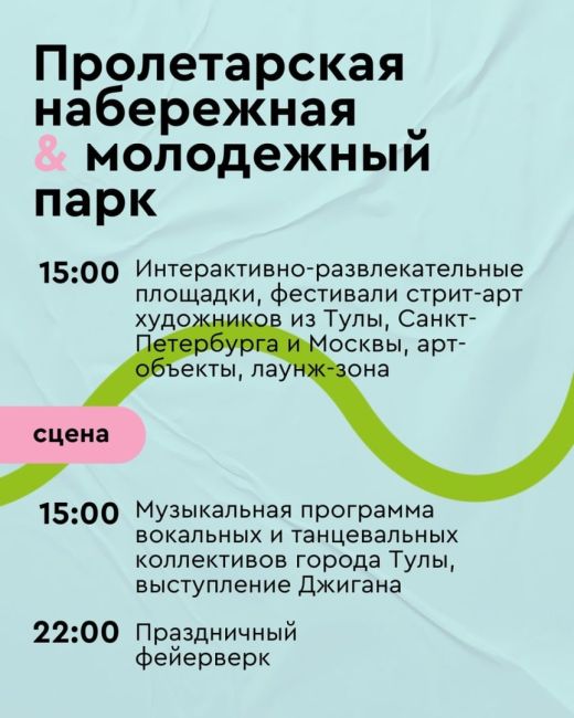 10 сентября Тула отметит день города. Основными площадками для проведения мероприятий станут площадь им. Ленина, Тульский кремль, Казанская набережная, музейный квартал улицы Металлистов, Пролетарская набережная и Молодежный парк.