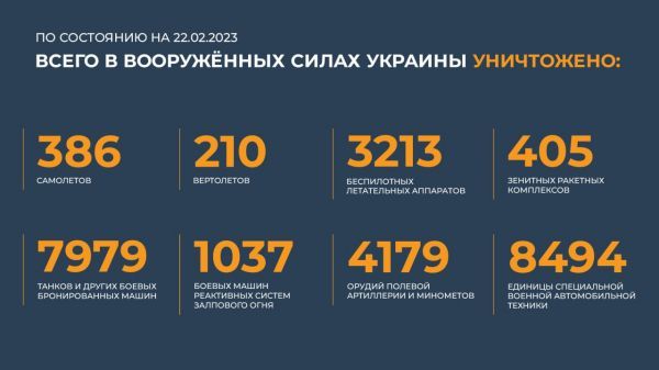 Всего с начала проведения специальной военной операции уничтожены: 386 самолетов, 210 вертолетов, 3213 беспилотных летательных аппаратов, 405 зенитных ракетных комплексов, 7979 танков и других боевых бронированных машин, 1037 боевых машин реактивных систем залпового огня, 4179 орудий полевой артиллерии и минометов, а также 8494 единицы специальной военной автомобильной техники.