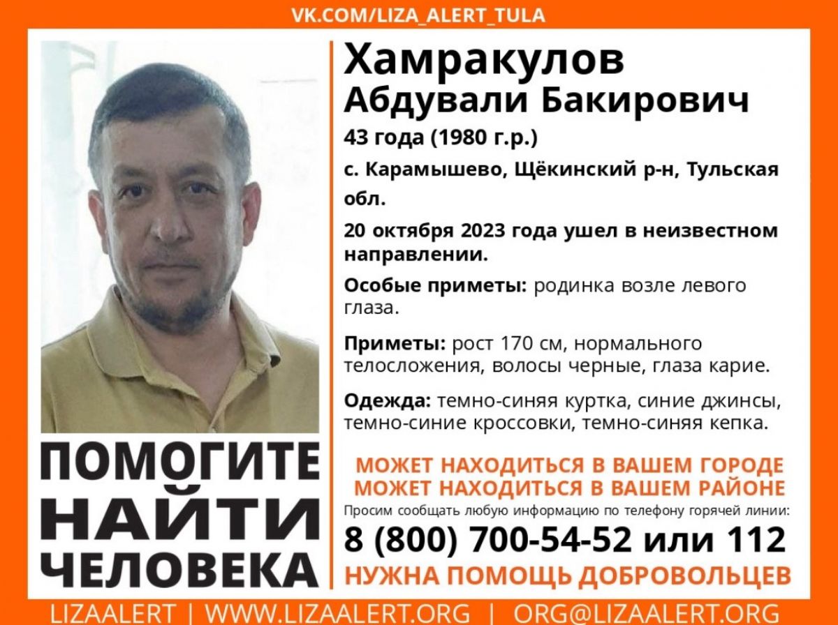 В Тульской области третий день ищут 43-летнего Абдували Хамракулова. Как сообщает поисковый отряд «Лиза Алерт», 20 октября он ушёл в неизвестном направлении. Его последнее место нахождения – село Карамышево Щёкинского района.