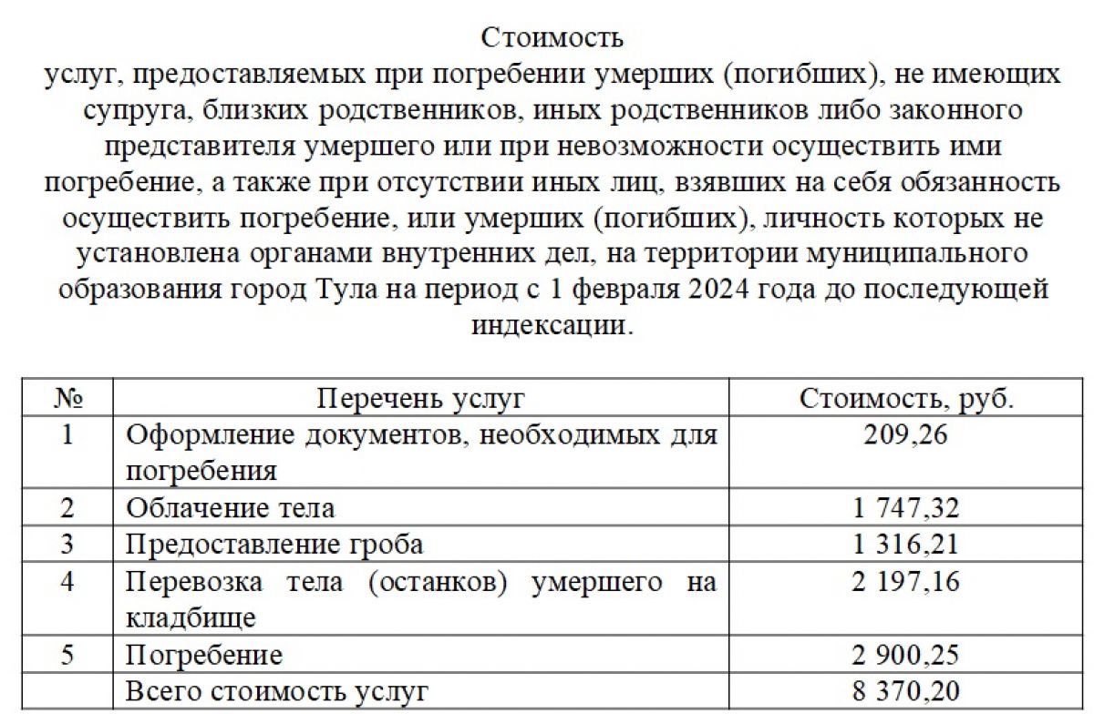 В документе указано, что стоимость работ по погребению лиц, не имеющих родственников и тех, чья личность не установлена, обойдется в такую же сумму.
