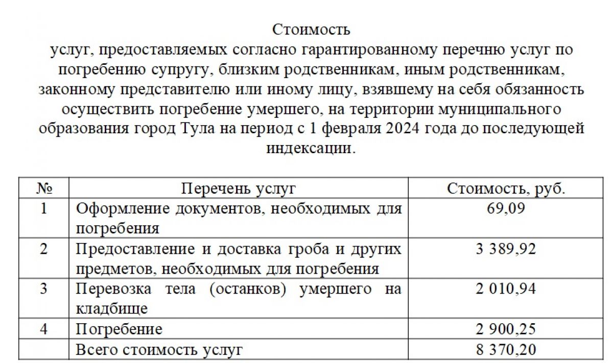 Новые расценки на погребение установлены в Туле постановлением администрации с 1 февраля. Так, стоимость услуг, которые гарантированы в МО, составит 8 тыс. 370 рублей.