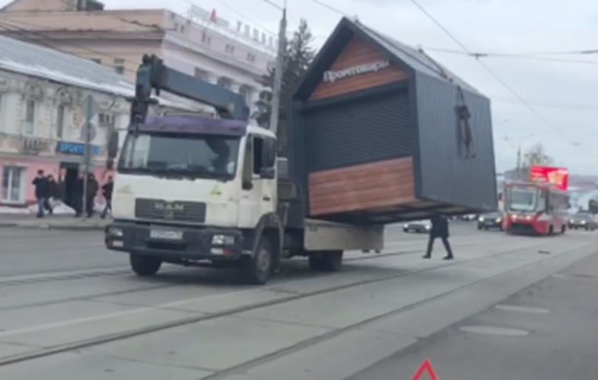 В Туле на ул. Советской во время перевозки торгового павильона произошла непредвиденная ситуация.