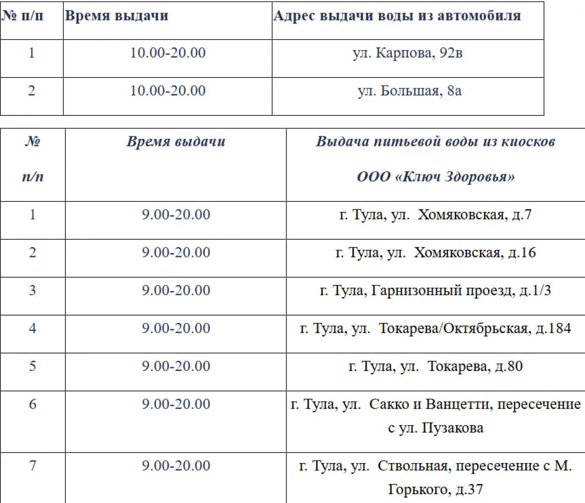 Кроме того, туляков предупреждают о возможном временном ухудшении состоянии воды после ее подачи. Публикуем адреса и время раздачи жидкости: