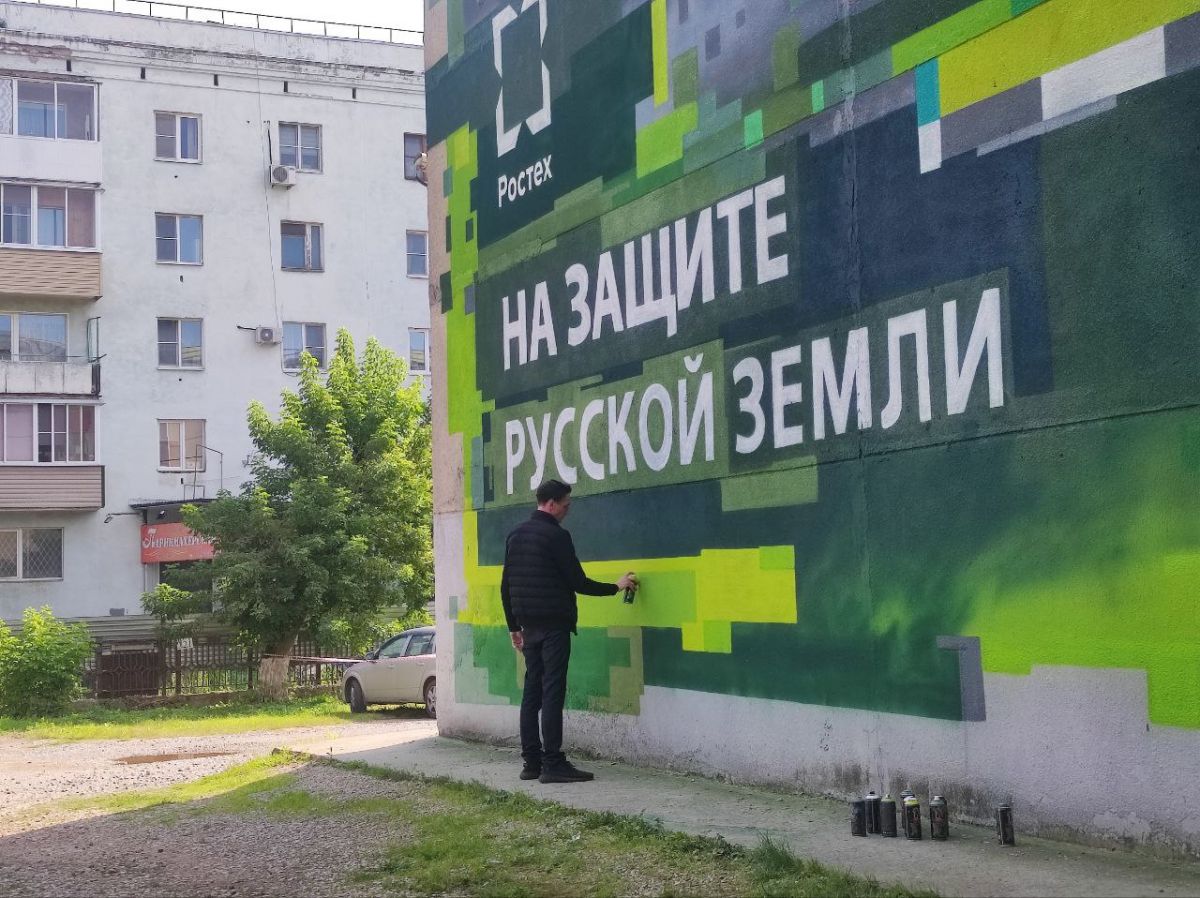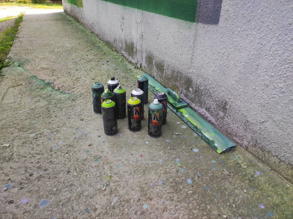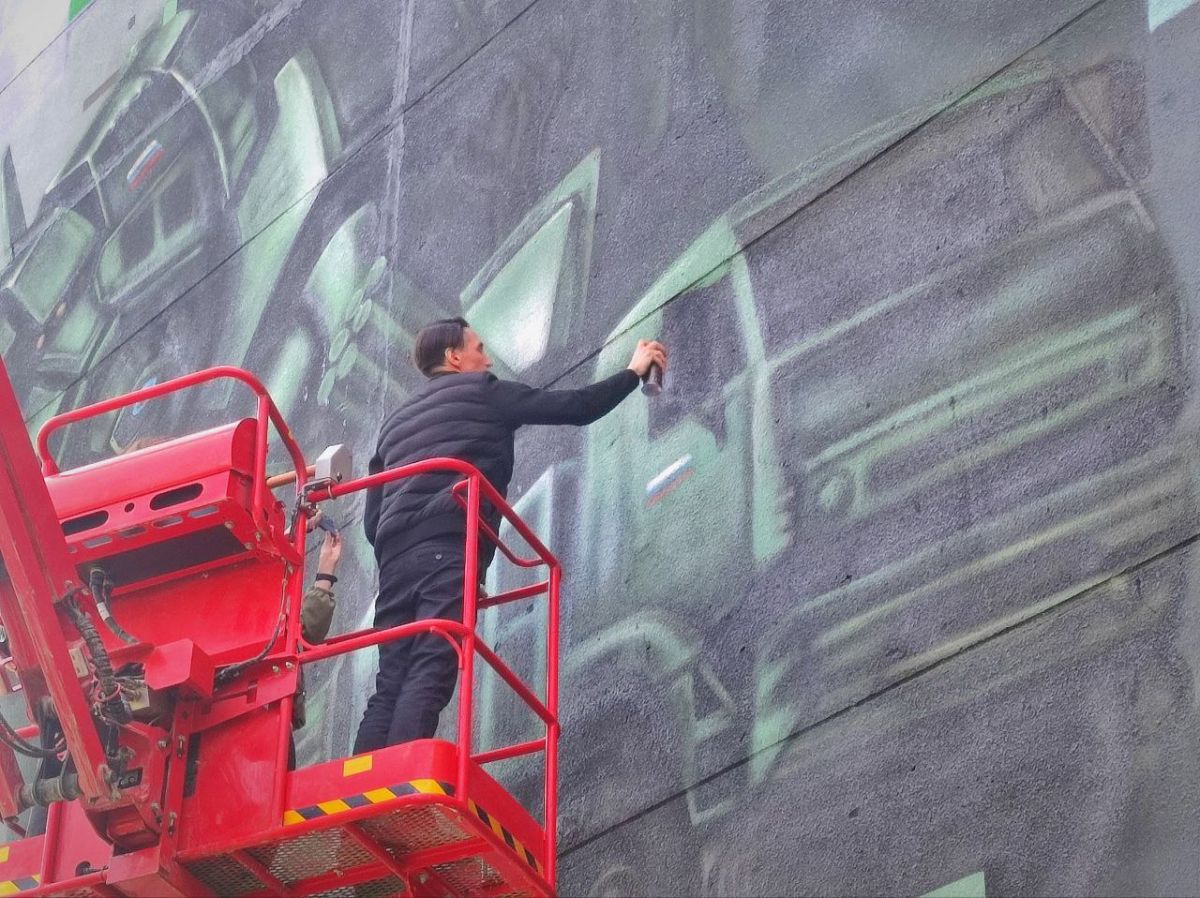 Отметим, что работа над муралом завершилась в кратчайшие сроки – всего за неделю. Антон работал в одиночку и единственными его помощниками стали 40 литров грунта, 60 литров краски и более 100 аэрозольных баллончиков, которые помогли создать объемы и тени. Все штрихи и мазки граффити были сделаны с помощью самодельной деревянной линейки.