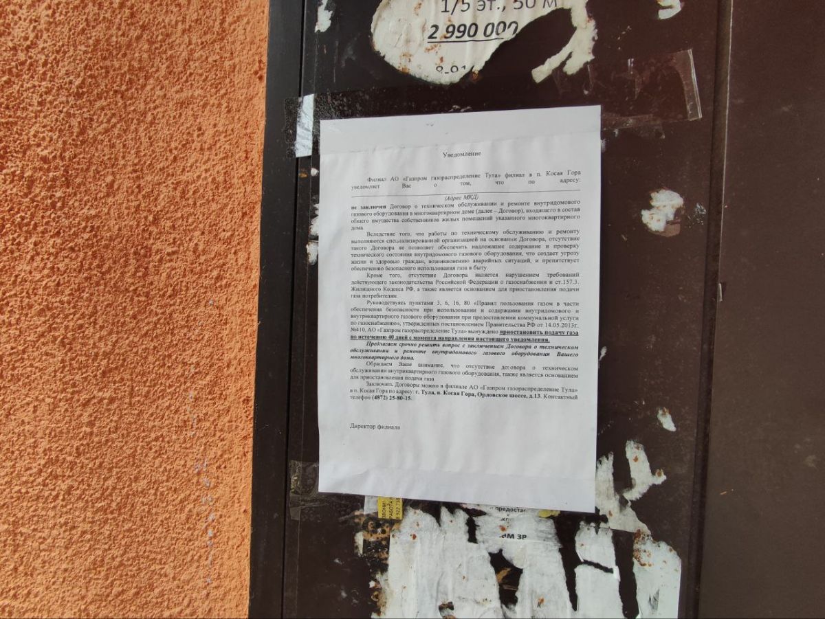 Интересным остается и тот факт, что на подъездных дверях некоторое время висело объявление от филиала АО «Газпром газораспределение Тулы», находящегося в поселке Косая Гора. Там компания проинформировала жильцов о том, что без договора на техобслуживание и ремонт газового оборудования она не может провести газ в квартиры, поскольку это небезопасно.