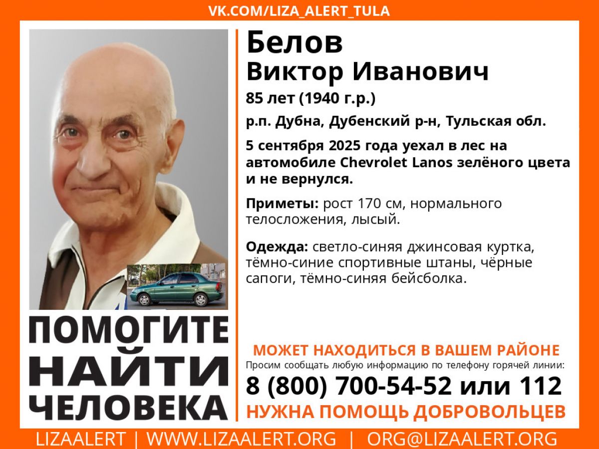 В рабочем посёлке Дубна Тульской области пропал 85-летний Виктор Белов. Как сообщает поисковый отряд «ЛизаАлерт», его местонахождение неизвестно с 5 сентября. В минувшую пятницу дедушка уехал в лес на автомобиле Chevrolet Lanos и не вернулся.