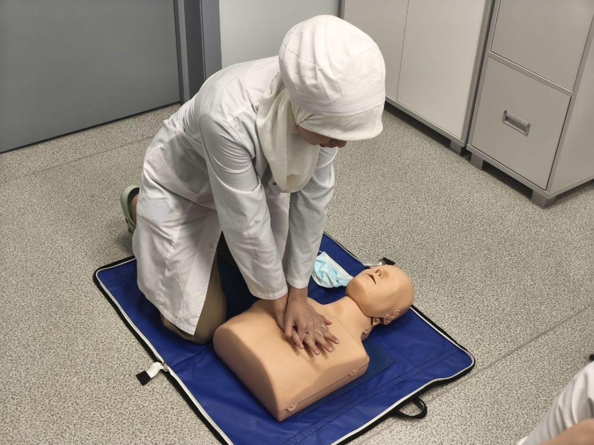 Так, например, в одной из аудиторий будущая медсестра, следуя пошаговой инструкции преподавателя, оказывала помощь бездыханному муляжу.