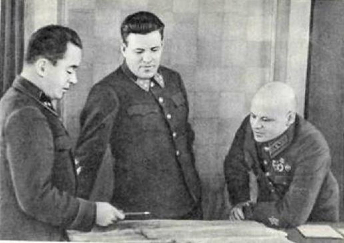 В штабе Московской зоны обороны. Слева направо: начальник штаба генерал-майор А.И. Кудряшов,командующий генерал-лейтенант П. А. Артемьев,дивизионный комиссар К.Ф. Телегин