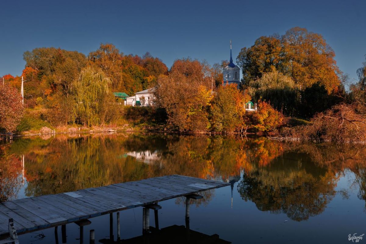 Поэтому так часто на мостках можно видеть кого-то, кто смотрит, как на зеркало пруда ложатся желтые листья, а на противоположном берегу белая с синим колокольня указывает направление — прямо в небо.