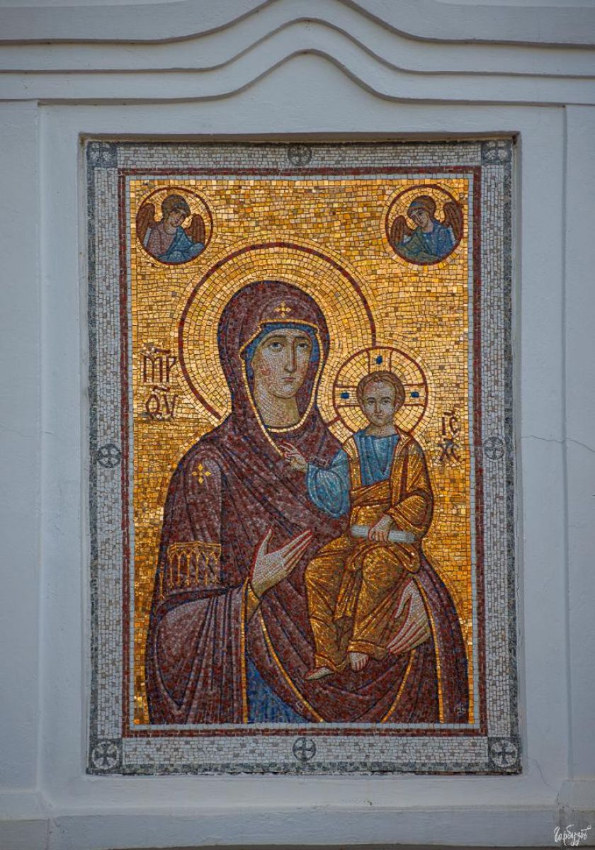 Солнечные лучи ложатся то так, то эдак, придавая объема и без того немаленькой церкви. А с белой стены смотрит Богородица с Младенцем – мозаика встречает всех, кто приближается к храму.