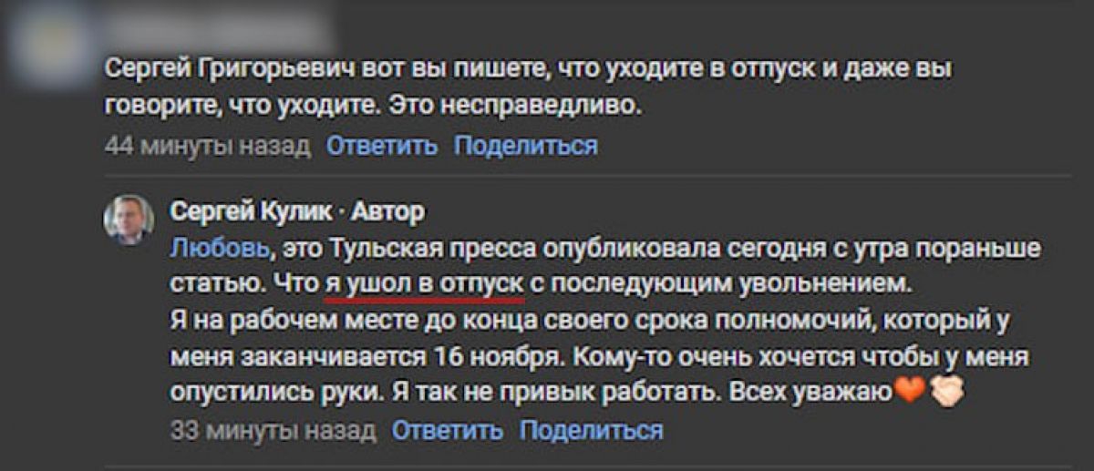 Напомним, что ранее мы говорили о том, что глава администрации Донского Сергей Кулик покинет свой пост. В скором времени он дал опровержение и рассказал в своих социальных сетях о том, что "тульские журналисты отправляют меня в отпуск", отметив, что он продолжает работать в прежнем темпе, стараясь выполнить в срок все взятые на себя обязательства.