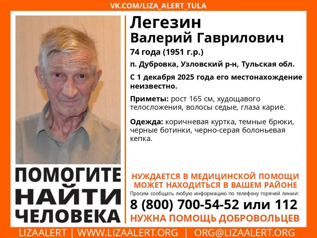 В Узловском районе в поселке Дубровка ищут 74-летнего Валерия Легезина, пропавшего пять дней назад. Ориентировкой поделились в «ЛизаАлерт».