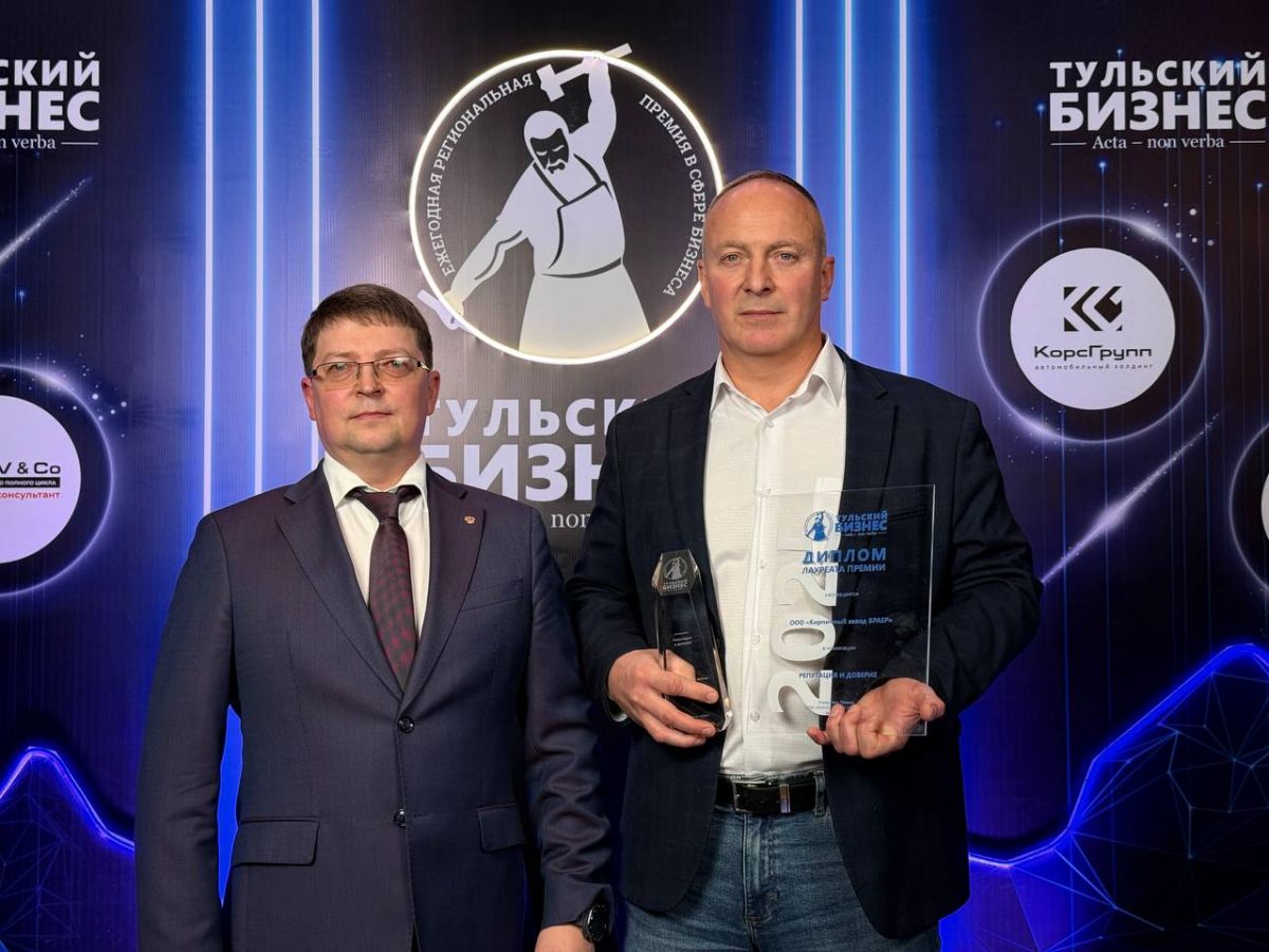 В числе награждённых — ООО «Кирпичный завод Браер», удостоенное звания лауреата в номинации «Репутация и доверие». Статуэтку премии заместителю генерального директора Андрею Бурмистрову вручил министр промышленности Тульской области Николай Еланцев.