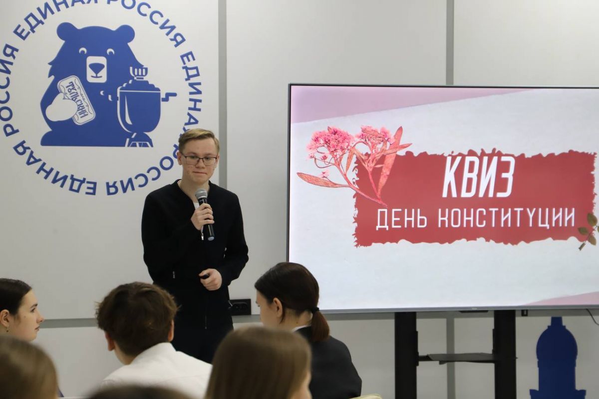 На площадке Штаба общественной поддержки «Единой России» в Тульской области прошло мероприятие, посвящённое Дню Конституции Российской Федерации. В рамках федерального партийного проекта «Историческая память» для учащихся Центра образования – гимназии № 11 имени Александра и Олега Трояновских активисты регионального отделения «Молодой Гвардии Единой России», представители «Волонтёрской Роты», волонтёрского центра Партии, Молодёжной избирательной комиссии Тульской области и Молодёжного парламента при Тульской областной Думе организовали образовательную викторину по истории Основного закона страны.