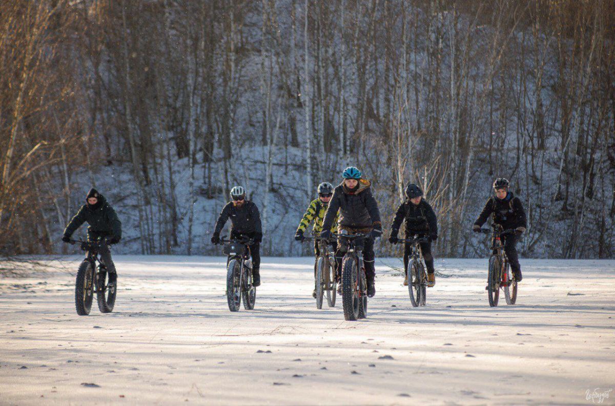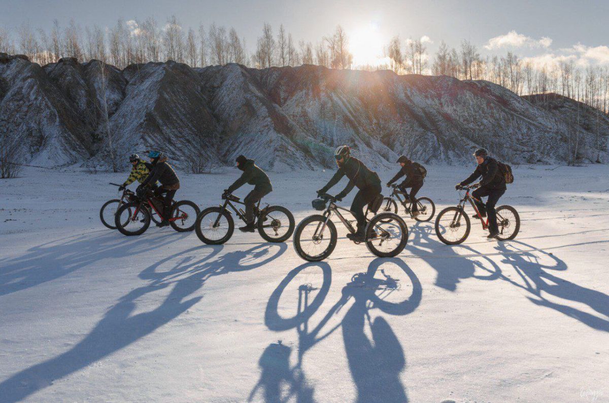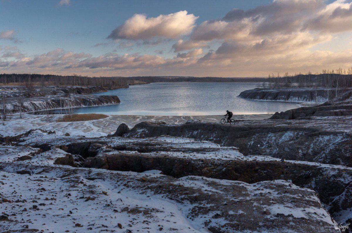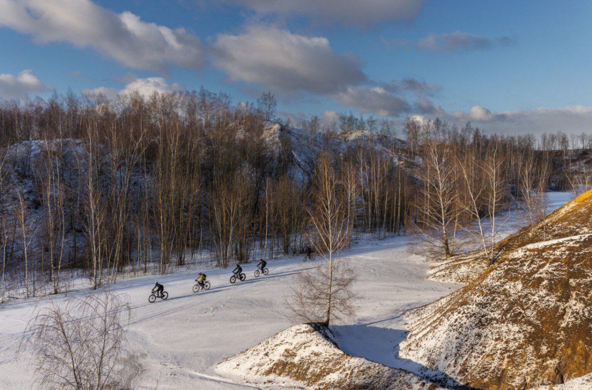 Сначала — длинные ровные участки по замёрзшим чашам карьеров. Велосипеды выстраиваются в цепочку, снег хрустит под колёсами, а вокруг — берёзовые склоны, будто аккуратно расставленные декораторами.
