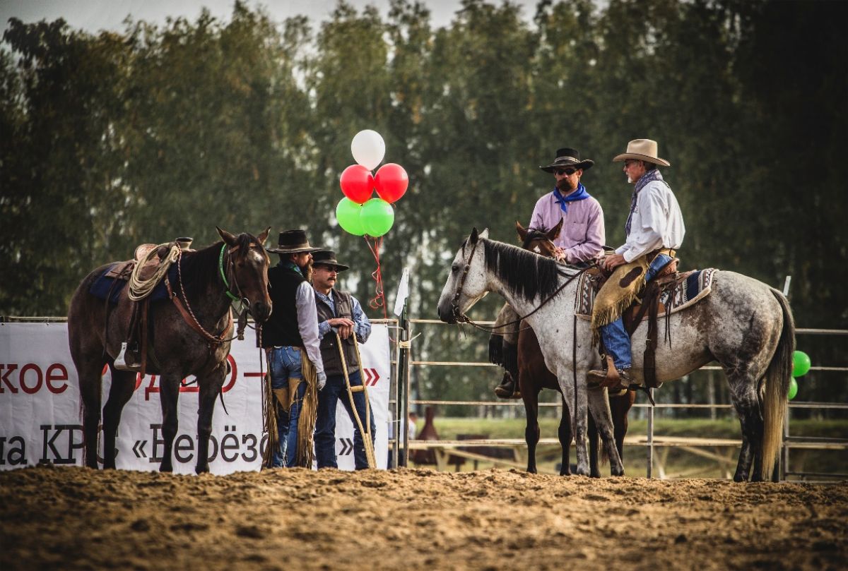 - Каждый ковбой привозил с собой в Россию свою привычную амуницию. Вместе с ними приехала вся легендарная, известная только по фильмам атрибутика – настоящие ковбойские шляпы для защиты от солнца и осадков, шейные платки, которые можно быстро натянуть на лицо для защиты от пыли и ветра, джинсы, чапсы (защитные накладки на ноги, надеваемые поверх джинсов, которые служат для защиты от грязи, пыли, влаги, ушибов и потертостей), клетчатые рубашки, жилетки, сапоги со шпорами. Они же привезли и правильную ковбойскую амуницию для верховой езды – уздечки с поводьями, седла, вальтрапы, недоуздки. Некоторые американцы также привозили с собой своих лошадей.
