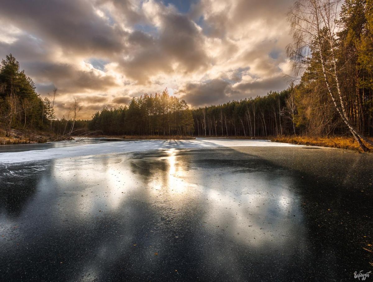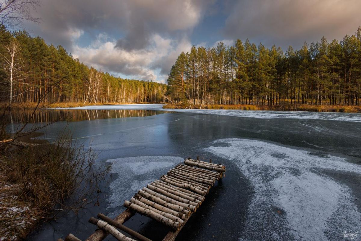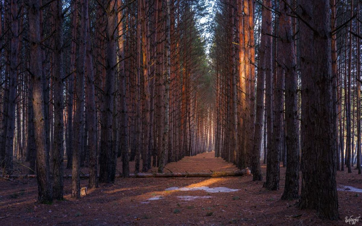В лужах лёд искрится, переливается, отражает свет низкого солнца и бросает его пятнами на стволы сосен и елей.