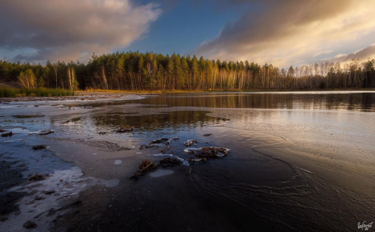Лес и карьеры живут в этом пограничном состоянии. На озёрах появляется первый лёд — тёмно-синий, почти свинцовый, с матовыми разводами и прозрачными прожилками. Он ещё тонкий, но уже уверенный на вид, словно примеряет на себя роль настоящей зимы.