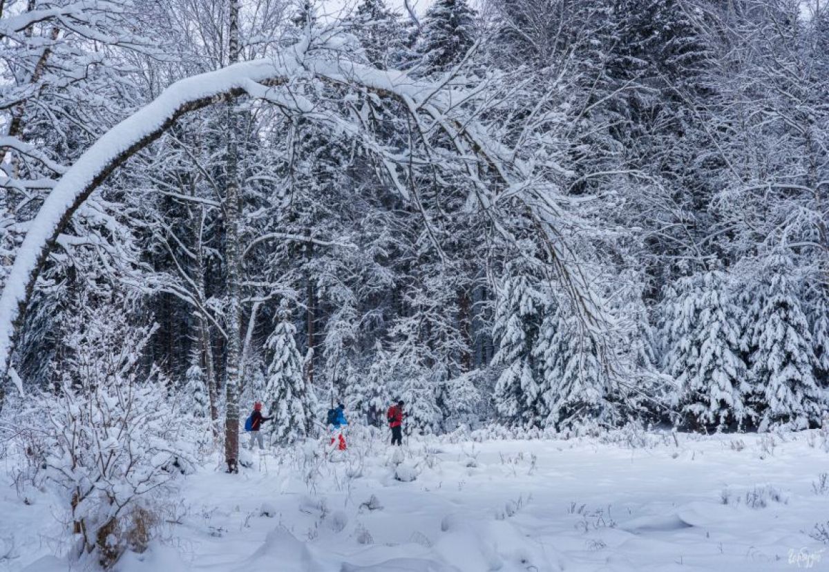 Рано утром приехали на точку старта, пристегнули лыжи — и сразу шагнули в лес. Погода была редкостно удачной: лёгкий мороз, свежий снег и солнце, которого в наших краях не было уже несколько недель.