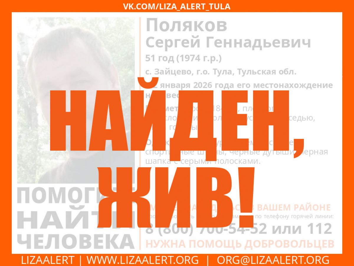 Житель села Зайцево, входящего в городской округ Тула Тульской области, разыскивается родственниками и волонтерами. О розыске объявил 2 января тульский отряд "ЛизаАлерт". Сергей Геннадьевич Поляков, 51-го года от роду, перестал выходить на связь и покинул место своего проживания 2 января 2026 года. Его судьба до сих пор остается неизвестной.