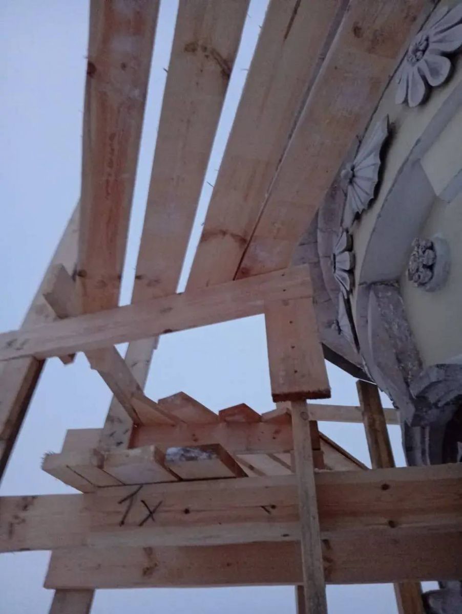Работы на уникальном памятнике архитектуры продолжаются и в праздничные выходные дни: установлены строительные леса, завезены материалы, осуществляется демонтаж поврежденных конструкций»
