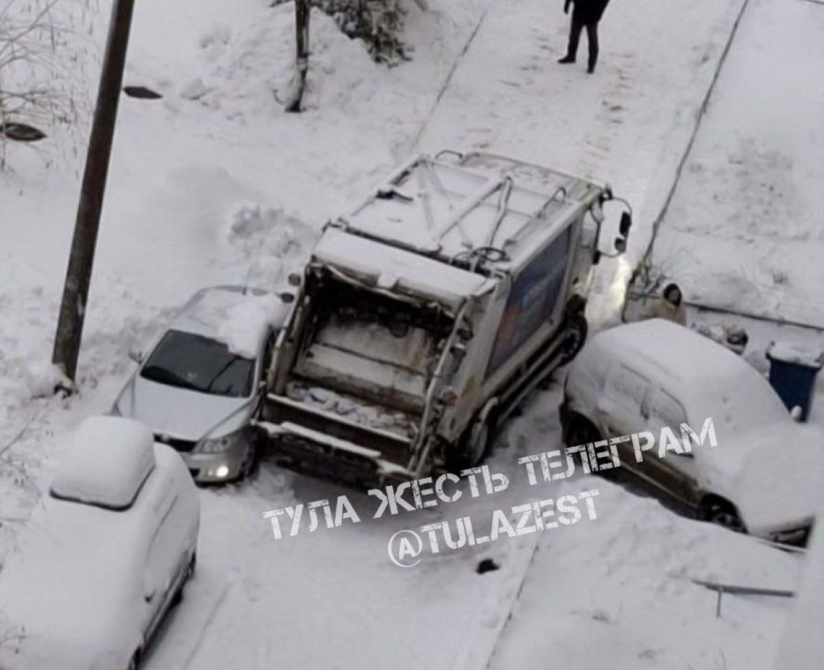 В Туле в спальном районе по улице Бондаренко утром 9 января грузовик, похожий на мусоровоз, задел припаркованную иномарку.