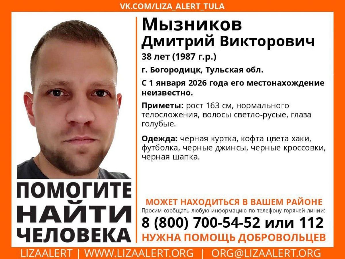 Тульский поисковый отряд "ЛизаАлерт" ищет 38-летнего жителя Богородицкого района Дмитрия Мызникова.