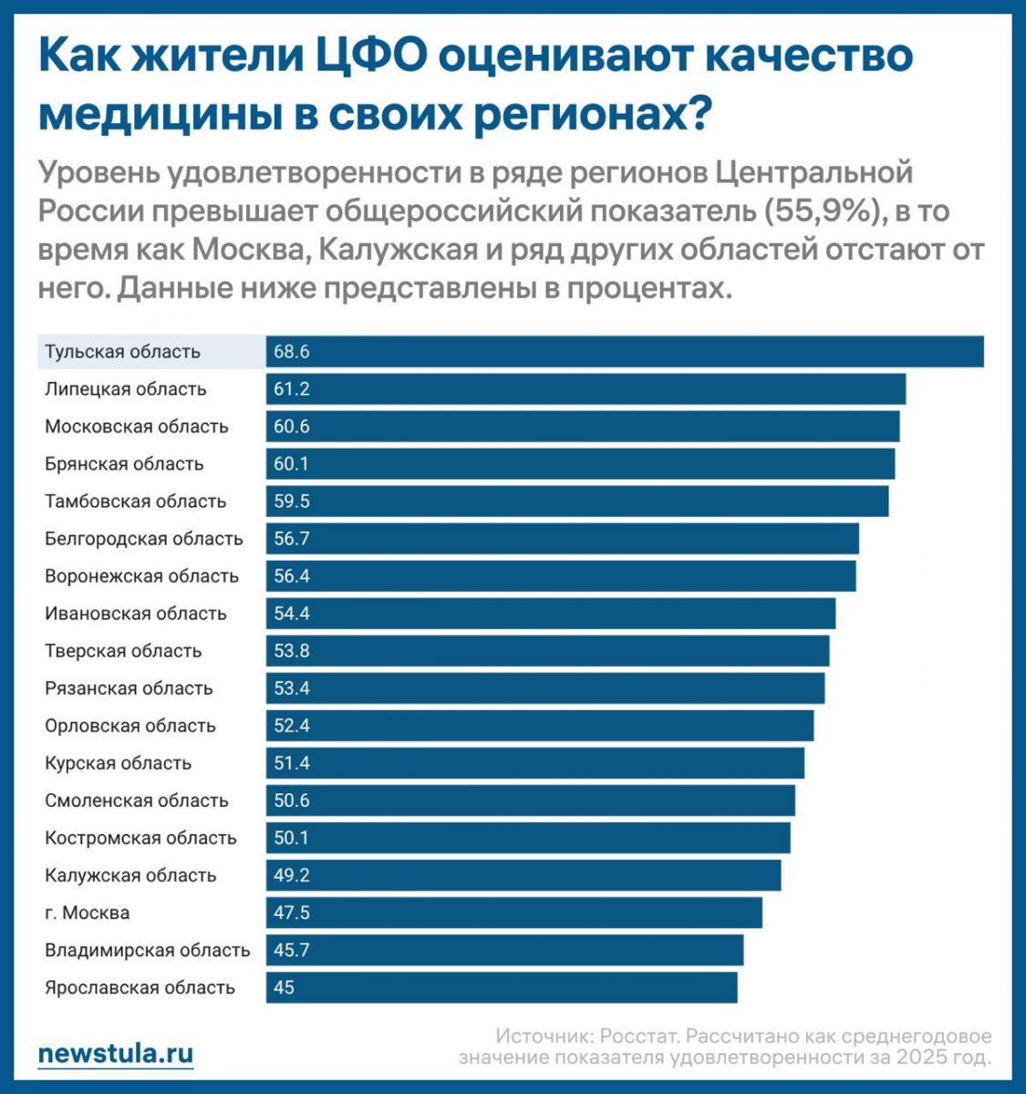Тульская область с большим отрывом возглавила рейтинг регионов ЦФО по удовлетворенности жителей медициной. Статистикой за 2025 год поделился Росстат.