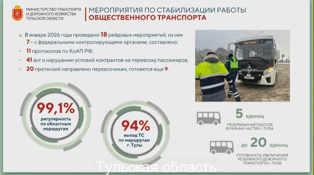 "На сегодняшний день регулярность по Туле - более 86%, в сравнении с январем 83,7%. Мы стремимся к 100% регулярности", - отметила Воскресенская.