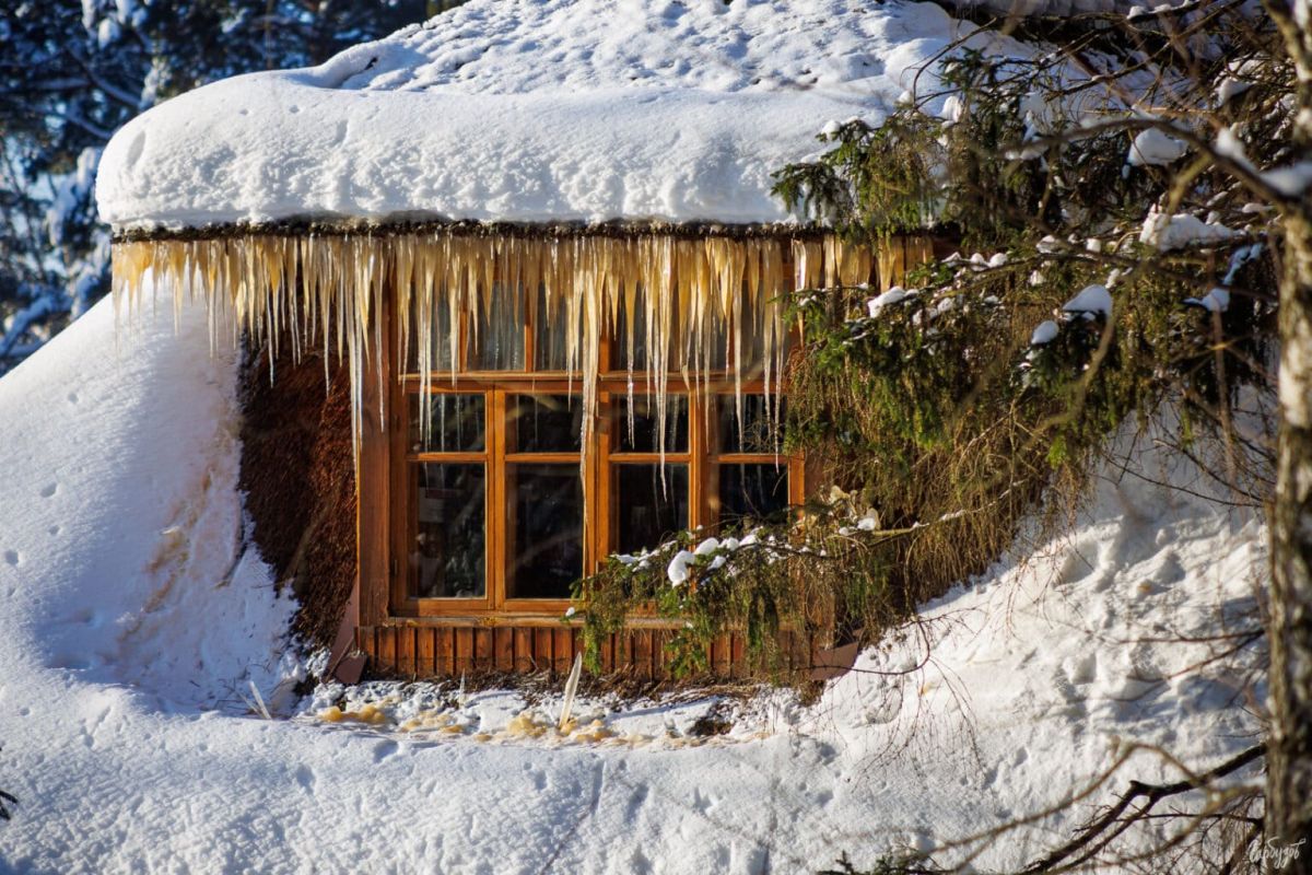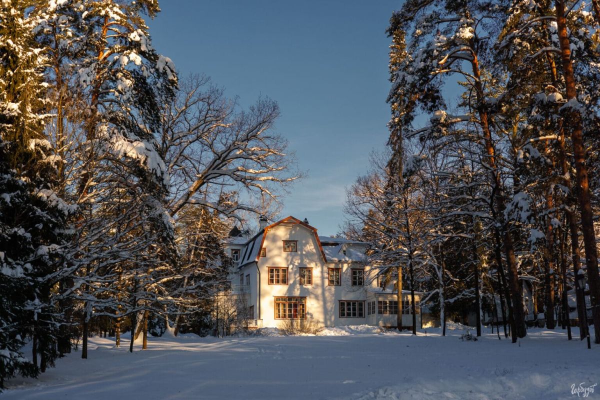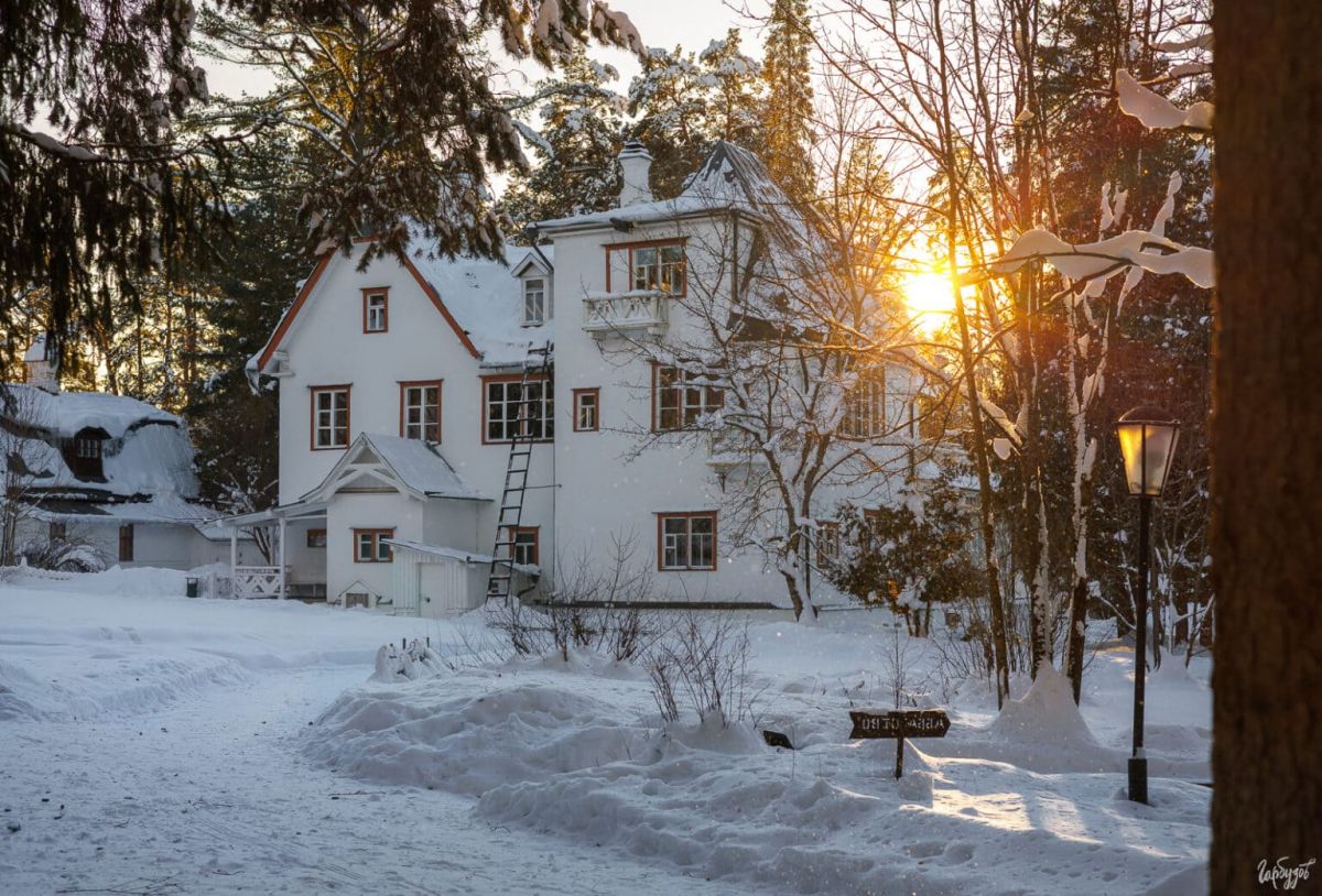 Дома в усадьбе художника зимой кажутся особенно уютными. Белые стены, тёмные окна, крыши под тяжёлым слоем снега — всё это создаёт ощущение тишины и защищённости.