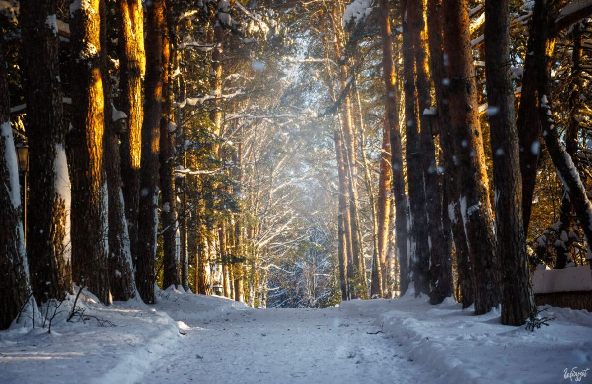 Лес вокруг Поленово вечером словно смыкается плотнее. Высокие сосны и голые ветви лиственных деревьев ловят последние солнечные лучи, окрашиваясь в тёплые золотистые оттенки. Свет пробивается между стволами, ложится на снег длинными полосами, и кажется, что сам воздух становится плотнее.