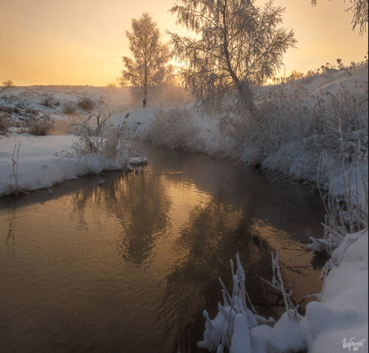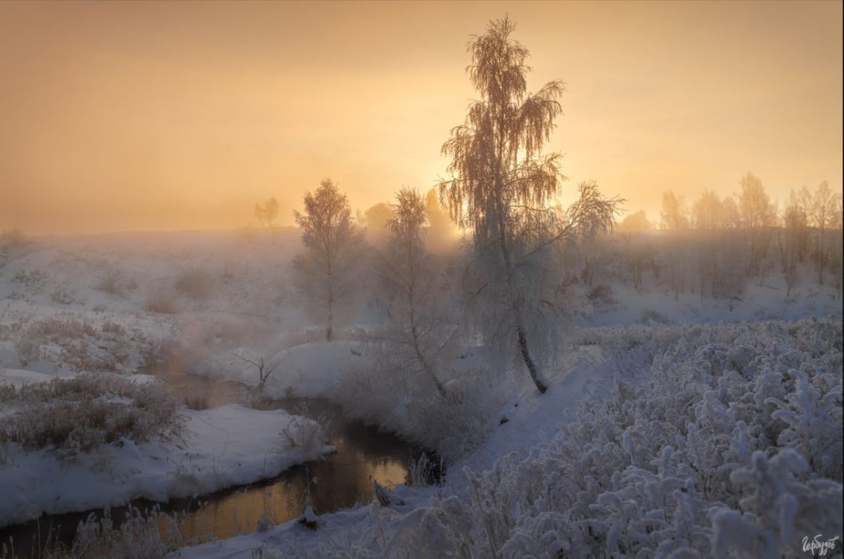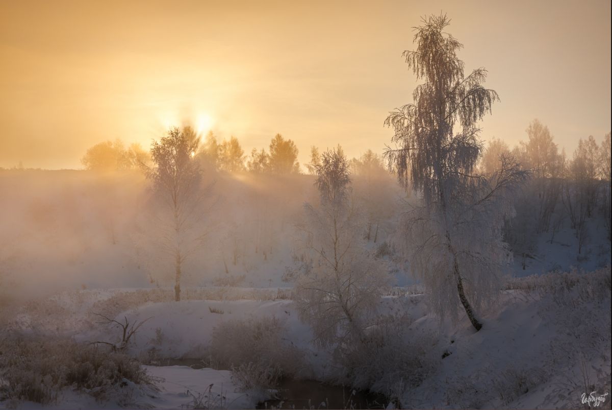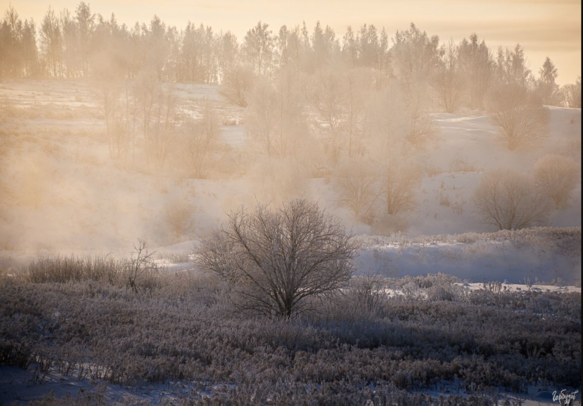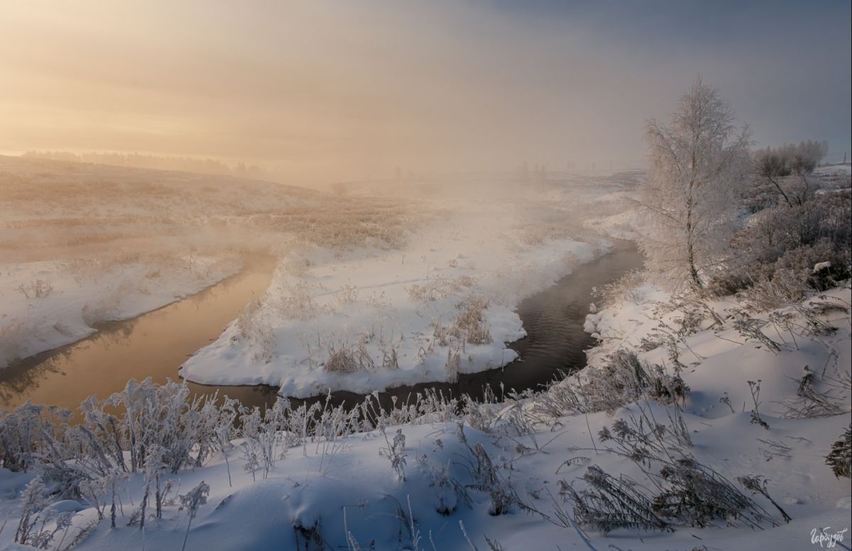 Солнце ещё не показалось над горизонтом, но его свет уже разливался по небу густым медовым цветом. Внизу, среди заснеженных берегов, лениво извивалась узкая речка. Тёплая вода, не скованная льдом, отдавала пар, и этот пар, подсвеченный первыми лучами, превращал привычный пейзаж в почти сказочную сцену. Берёзы стояли в инее — тонкие ветви будто вырезаны из серебра.