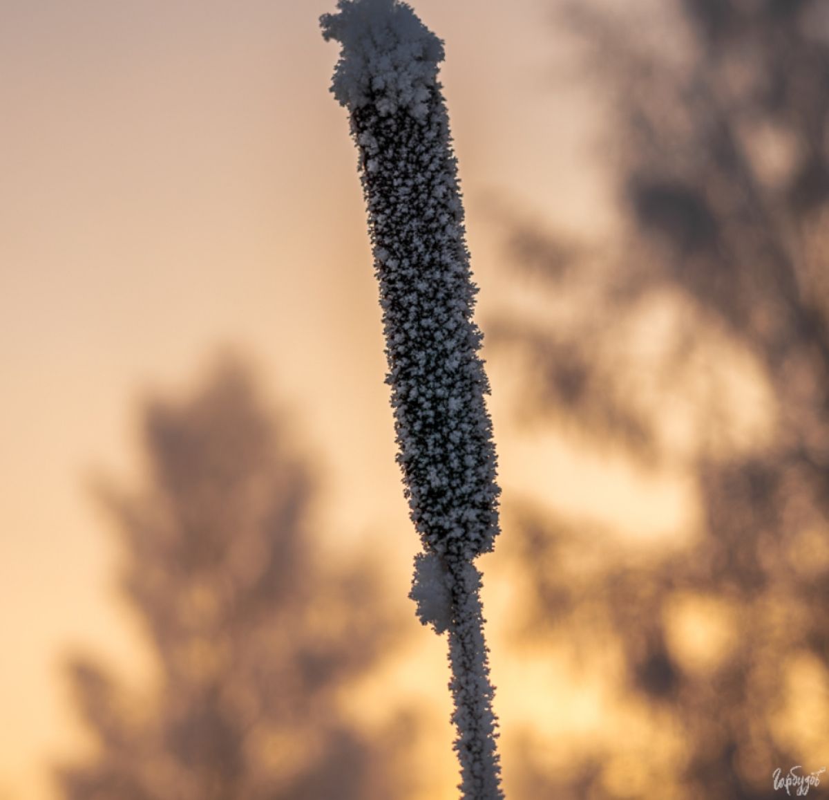 Макро — отдельная история. Замёрзшие соцветия, покрытые кристаллами инея, на фоне тёплого неба выглядят почти графикой. Минимализм, контраст фактуры и света — ничего лишнего.