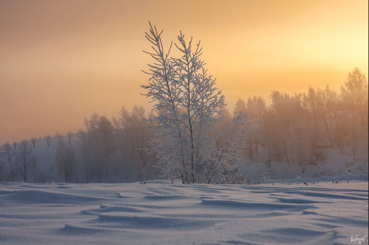 Склон с небольшим деревцем в качестве крупного плана — словно иллюстрация к учебнику по композиции. Снежные волны на переднем плане, золотое небо вверху и тонкий силуэт в центре — всё просто, но работает безотказно.