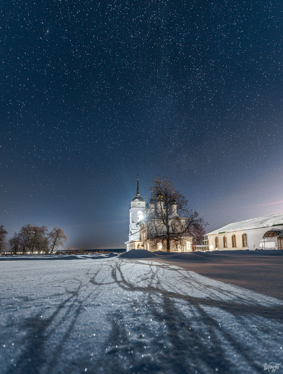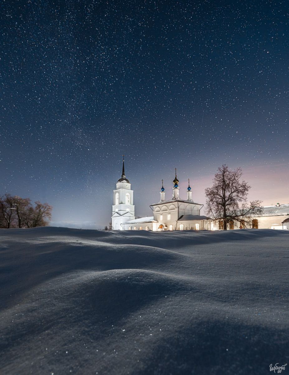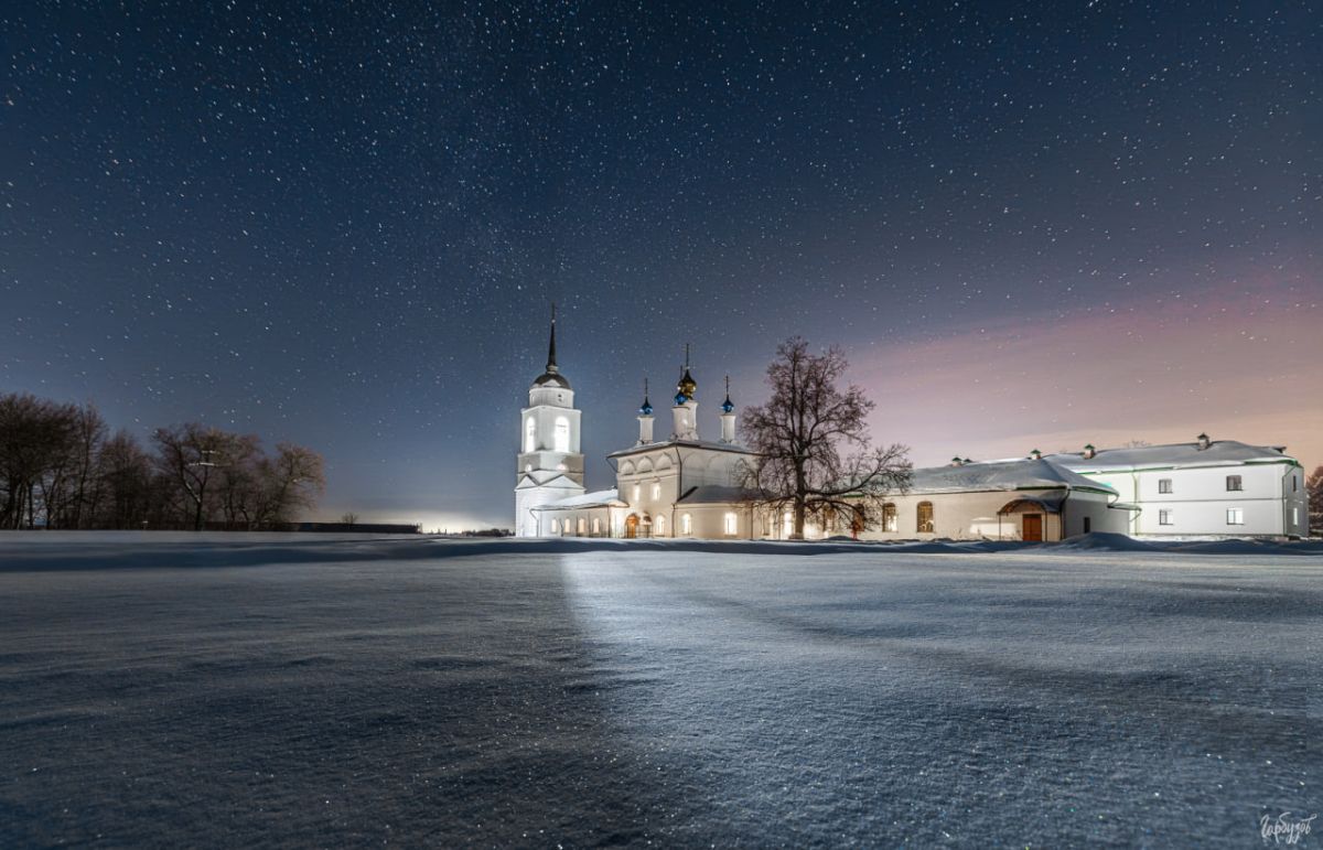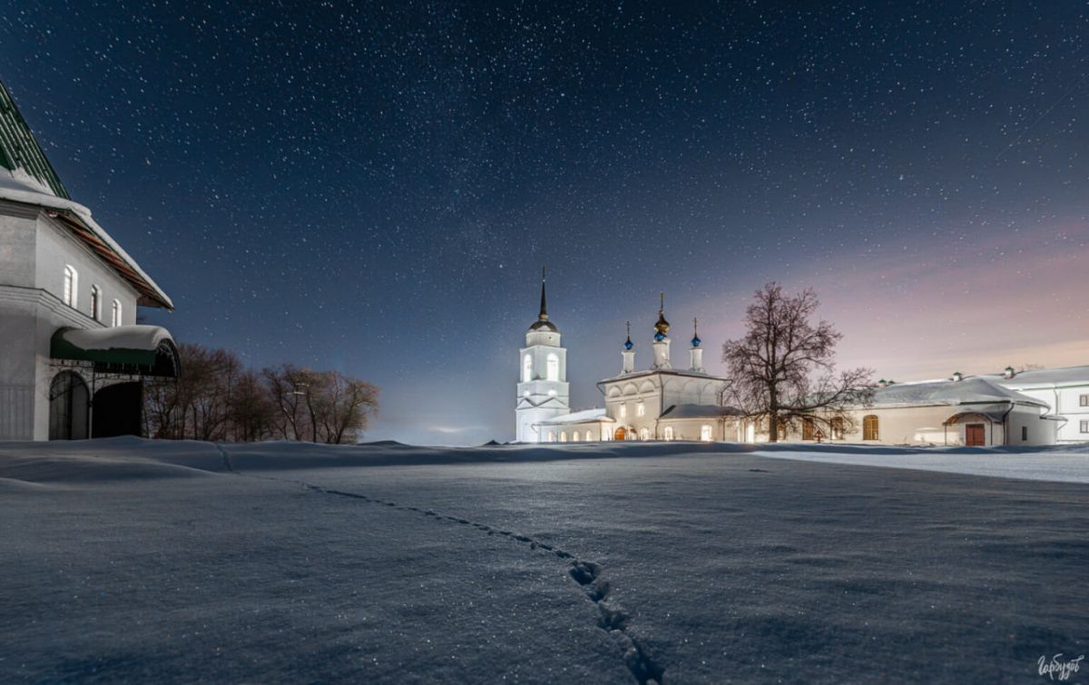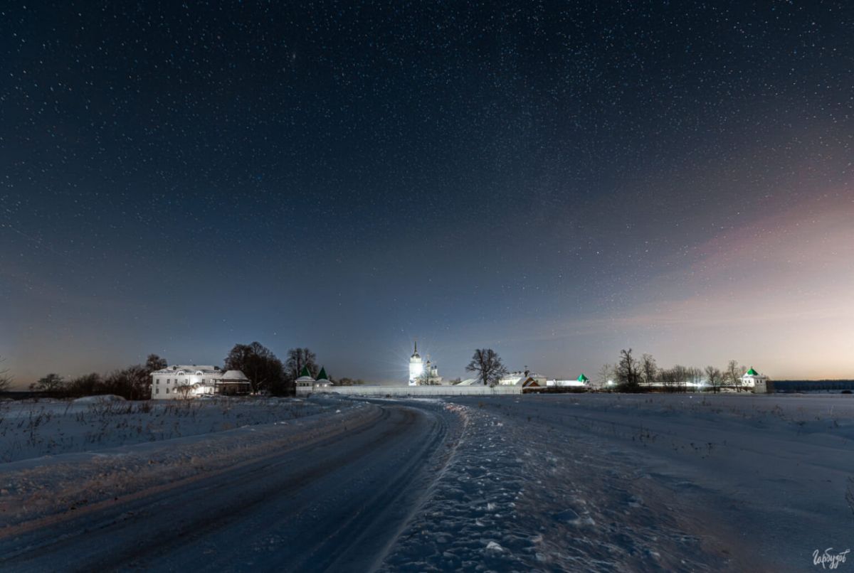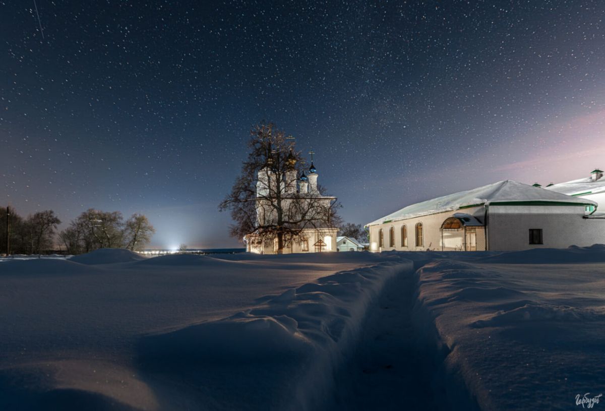 Ночной Добринский монастырь — это уже не про графику и форму, как днём. Это про масштаб. Про ощущение маленькой освещённой обители посреди бескрайнего зимнего поля и огромного звёздного неба. Про редкое состояние, когда стоишь в снегу, смотришь вверх и понимаешь — ради таких кадров и таких ощущений стоило вернуться.