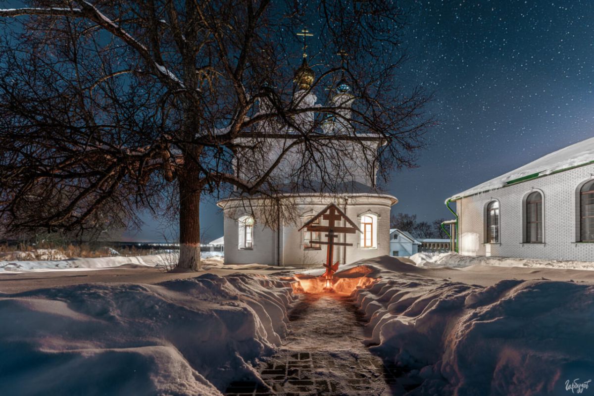Дорожка, протоптанная в снегу, уводит к поклонному кресту. В темноте он кажется почти графическим знаком — строгим, чётким. А под ним — тёплый свет лампады, маленький огонь среди огромного космоса. Этот контраст особенно остро ощущается как раз ночью: человеческое и вечное, локальное и бесконечное.