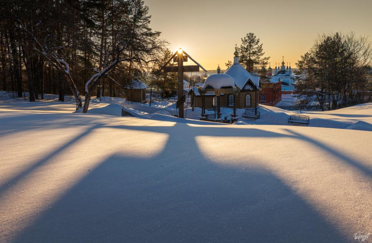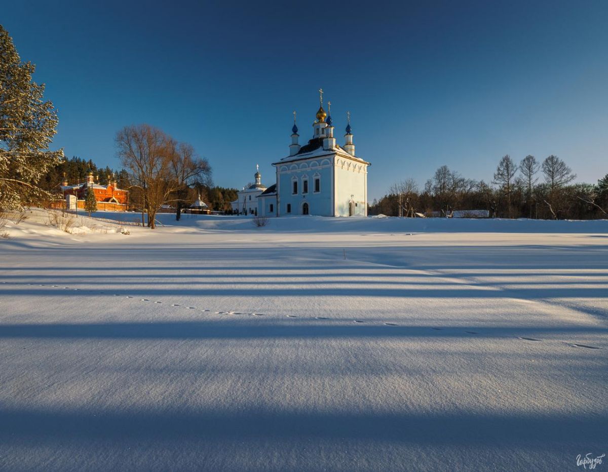 На закате обитель меняется ещё раз. Купола загораются тёплым золотом, синие главы становятся густыми и глубокими, как вечернее небо. Снег начинает светиться мягким янтарным оттенком, а тени ложатся широкими полосами.