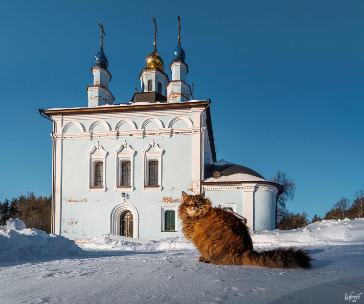 Иногда зима добавляет в кадр неожиданных героев. Огромный пушистый кот, восседающий на снегу у храма, выглядел полноправным хозяином обители. Он щурился на солнце и совершенно не спешил покидать пейзаж. В такие моменты понимаешь: монастырская жизнь — это не только купола и фрески, но и тихий быт, который делает место тёплым и настоящим.