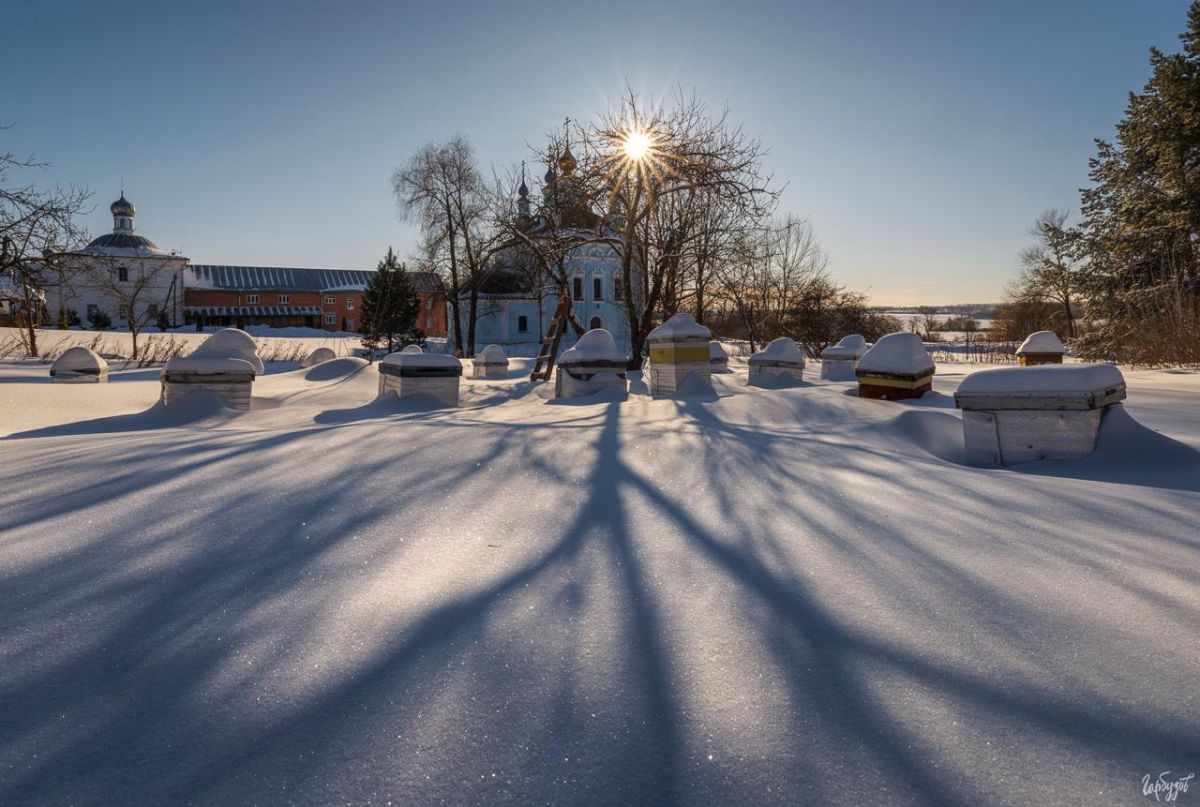 За храмом — пасека. Ульи, укрытые снежными шапками, выстроились в ряд, словно маленькие домики. Зимнее солнце низкое, жёсткое, и тени от деревьев тянутся к ним, как причудливые щупальца. Снег искрится так, что кажется — под ногами рассыпаны миллионы кристаллов. Тишина почти звенящая.