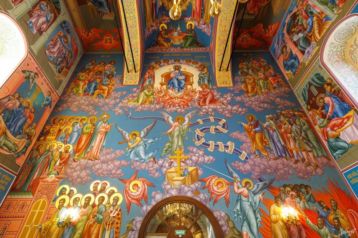 Внутри храма — совсем другой мир. После холодной синевы улицы интерьер встречает насыщенными красками росписей и тёплым золотом паникадила. Стены и своды расписаны густо, подробно, без пустот.