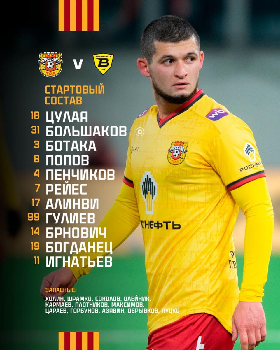 ФК «Арсенал»: Цулая, Большаков, Ботака, Попов, Пенчиков, Рейес, Алинви, Гулиев, Брнович, Богданец, Игнатьев.