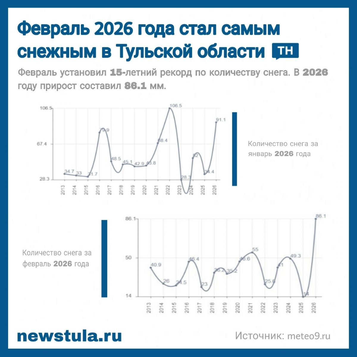 Январь этого года отметился 52.9 мм снежного покрова в Туле, а в том же месяце 2025 года выпало только 39.3 мм.