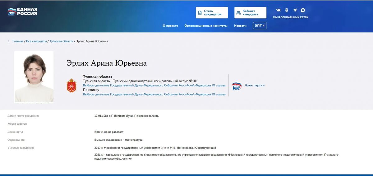 Эрлих Арина стала первым кандидатом на участие в предварительном голосовании «Единой России» на выборы в Государственную Думу от Тульской области. Информация появилась на сайте партии.