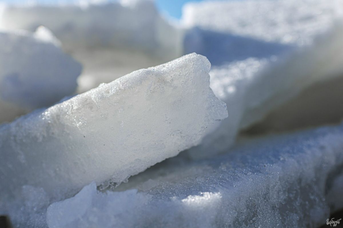 И в этих кучах льда, наваленных у берега, особенно хорошо видно, каким он на самом деле был всю зиму, просто мы видели только его «макушку». Толстый, плотный, местами прозрачный, местами матовый. Слои, трещины, пузырьки — целая история зимы, разложенная на куски.