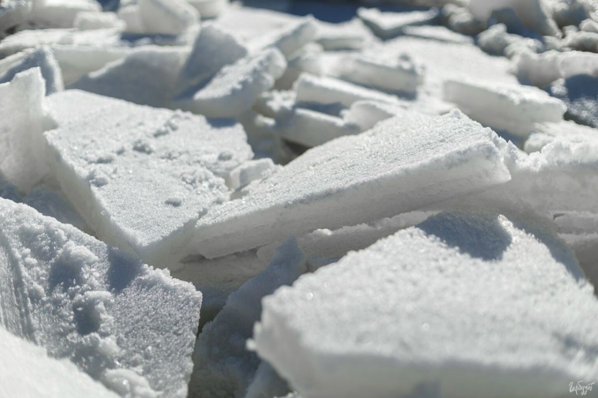 У берега лёд уже не цельный, а разбитый на тяжёлые пластины. Они наползают друг на друга, скрипят, крошатся, переворачиваются. Толстые, слоистые, с кромками, покрытыми инеем — каждая такая льдина, будто отдельный объект – со своей формой и фактурой.
