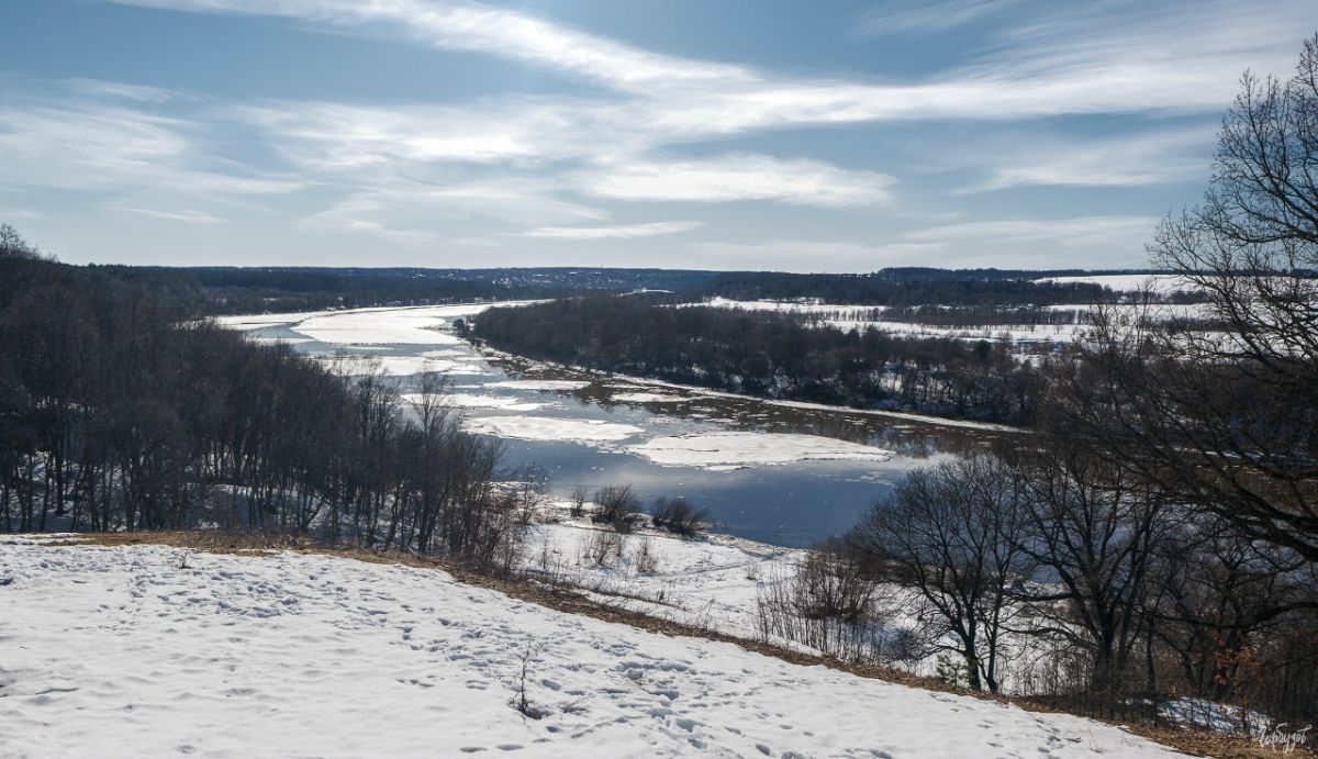 С высокого берега Ока ещё кажется спокойной. Белые поля льда, прорезанные тёмной водой, медленно ползут вдоль изгибов русла. Где-то уже открылись проталины, где-то лёд ещё держится, но видно — не надолго. Пейзаж обманчиво тихий, но это только издалека.