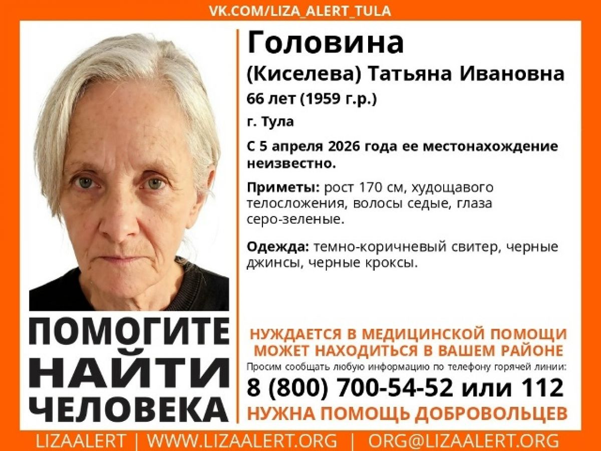 В Туле пропала 66-летняя пенсионерка, местонахождение которой неизвестно с 5 апреля 2026 года. Ее ищет тульский поисковый отряд «ЛизаАлерт», который опубликовал ориентировку в соцсетях.