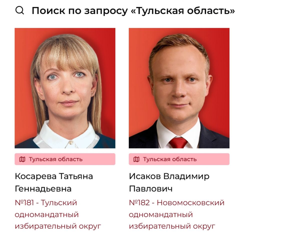 На данный момент от Тульской области на сайте партии два кандидата - Владимир Исаков (Новомосковский одномандатный избирательный округ) и Татьяна Косарева (Тульский одномандатный избирательный округ).